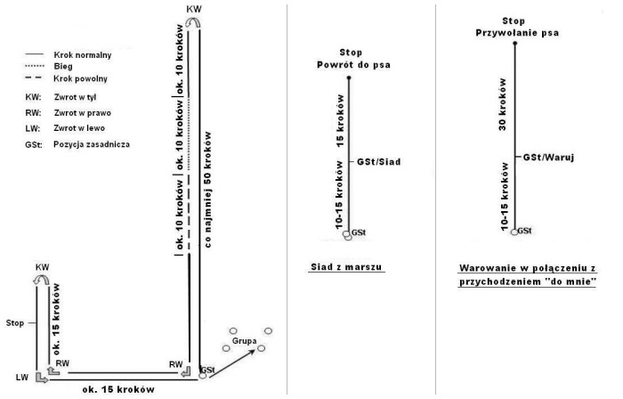 Opisane poniżej ćwiczenia są przykładowe i mogą zostać indywidualnie dostosowane przez sędziego do lokalnych warunków. Sędzia jest uprawniony do powtarzania lub zmiany ćwiczeń w przypadku wątpliwości w ocenie psów.